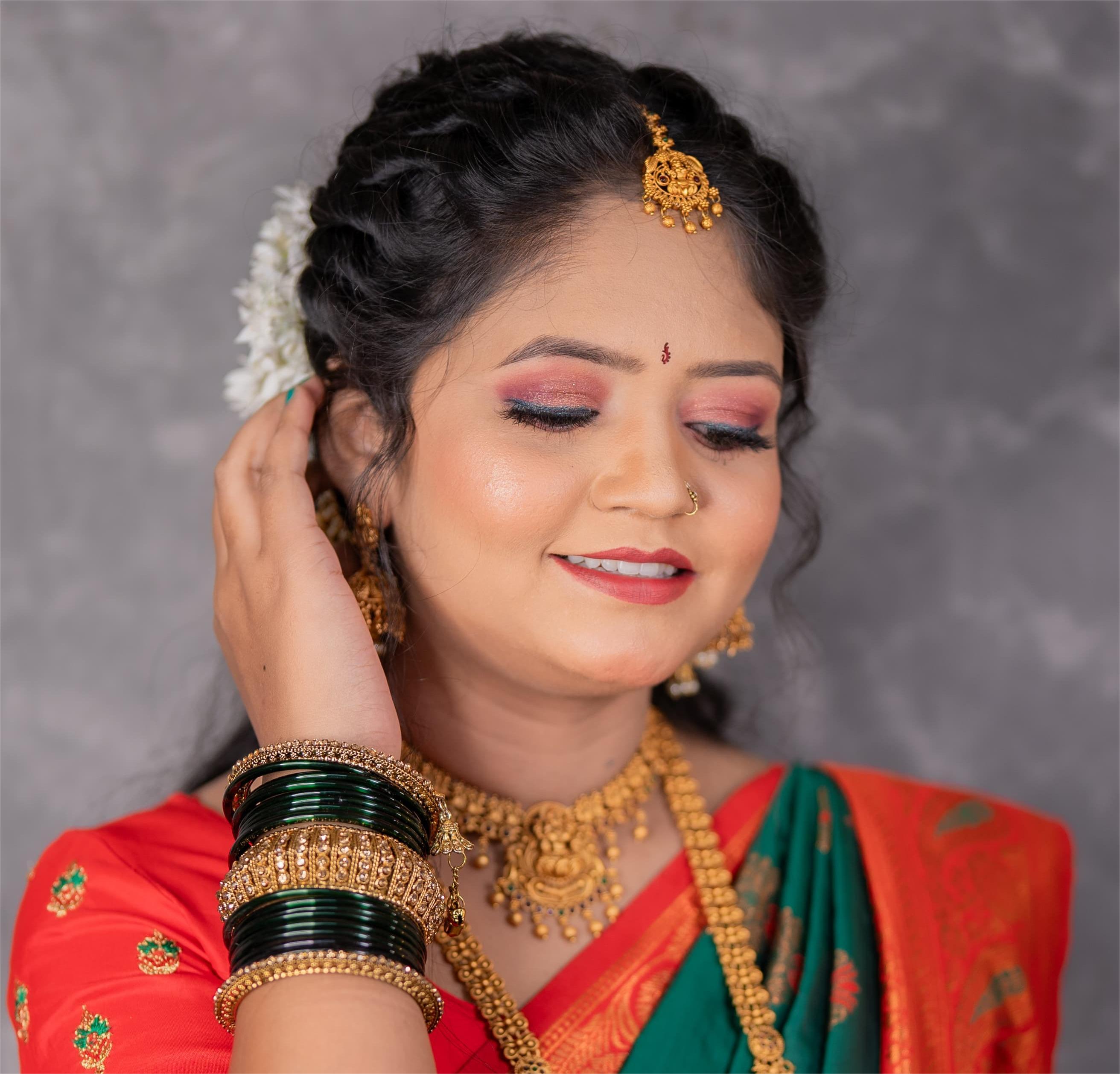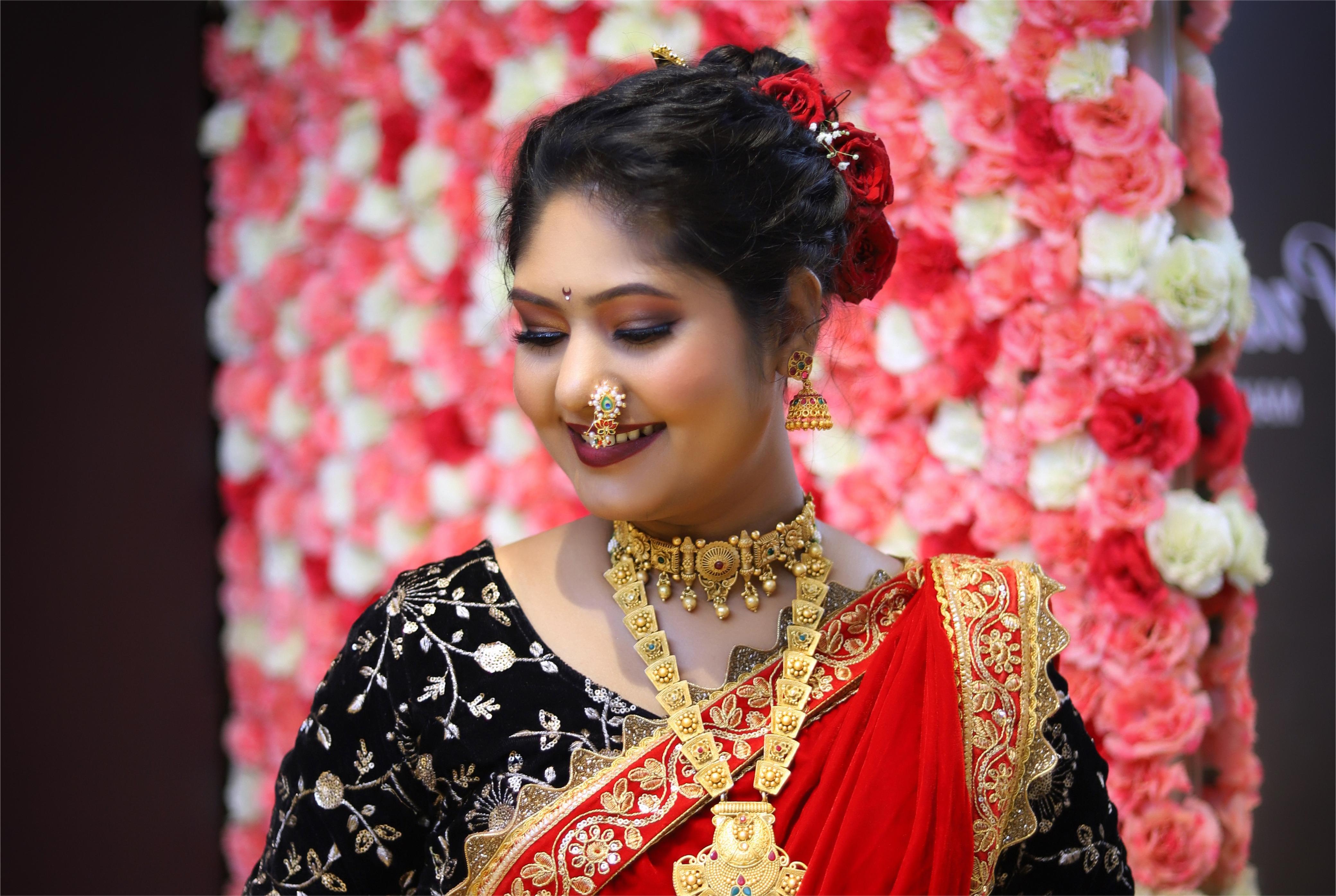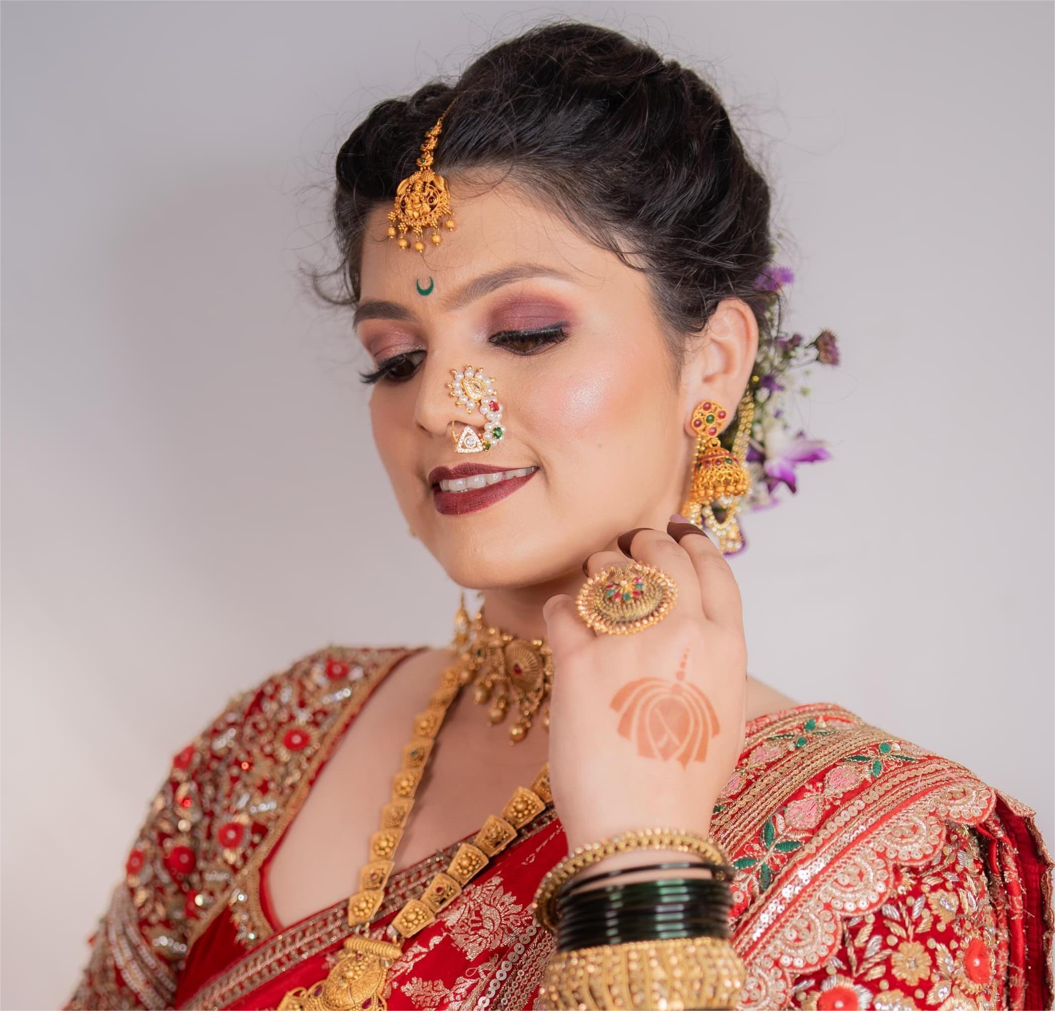 Bold eye makeup with copper tones, a striking red lip, and sharp brows. Finished with the iconic Maharashtrian 'nath' and floral-adorned bun, this look exudes regal tradition.