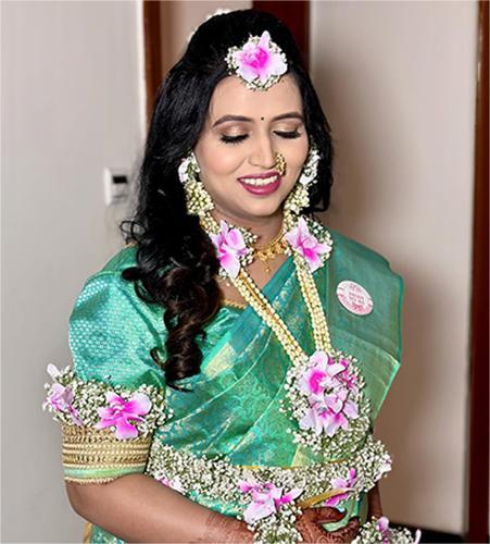 A classic South Indian look with bold, kohl-lined eyes, golden eyeshadow, and a rich red lip. Paired with traditional jewelry and fresh flowers in the hair, this look radiates timeless elegance.